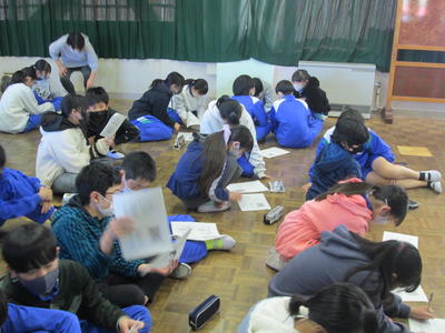 「想像力のスイッチを入れよう」という説明文の教材で、今日は筆者の示した事例とそれに対する意見を文章の中から読み取り、ワークシートにまとめました。全体で意見交換しながら整理しました。
