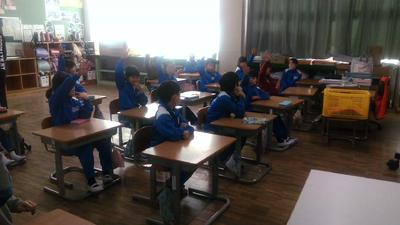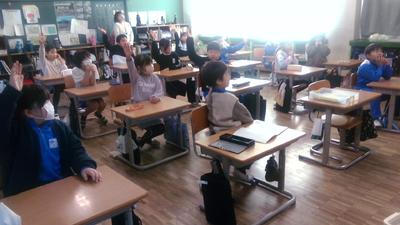 楽器の種類や音色を考える問題や音楽室にある楽器の数を答える問題など、画像交えてわかりやすく出題されました。各クラスでは友達と相談したり、「わかった!」などと声を出したりして楽しく答えていました。