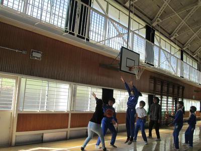 今日の昼休みは、6年生と先生方でバスケットのゲームをしました。ドッジボールと違って、背の高さが影響する競技なので、大人が有利でしたが、子供たちも数と運動量でカバーして、楽しくゲームしていました。