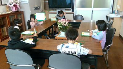 初めて入る校長室で周りを見回しながら、室内にある机や花や本棚などプリントに丁寧に記録しました。