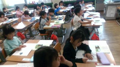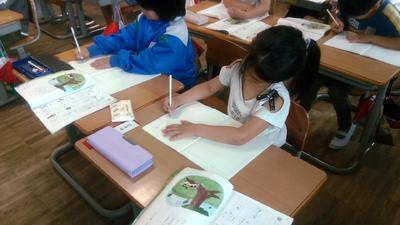 次に教科書の詩をノートに書き写す活動をしました。小さい「つ」や「ぴ」の丸の位置など確認しながら、子どもたちは一文字一文字丁寧に書いていました。