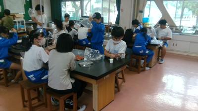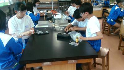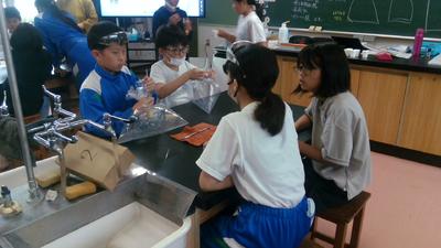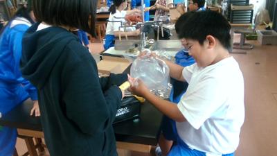 理科室で6の1の子どもたちがビニル袋を膨らませて何かの実験をしていました。