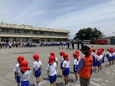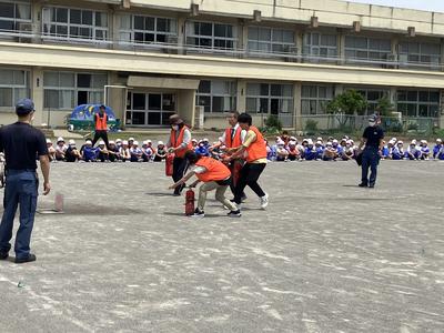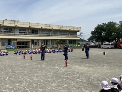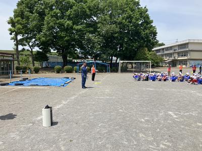 消防署長より、おさない、走らないなどの約束を守ってよくできたとお褒めの言葉をいただきました。短時間で集合し、人数確認が素早くできました。後半は消化器を使って消火訓練のデモンストレーションを行いました。