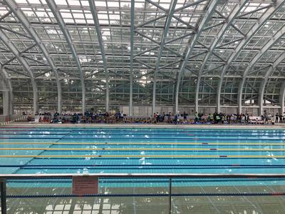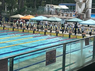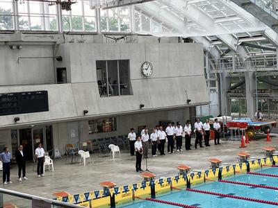 本日、第52回県小学校水泳教室記録会が敷島公園水泳場で行われています。今開会式が始まりました。