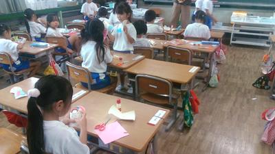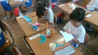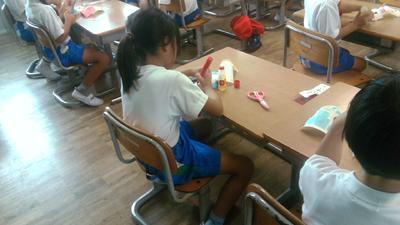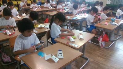 1年生のクラスで子どもたちが紙コップを使って楽しそうになにか作っていました。