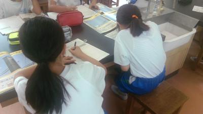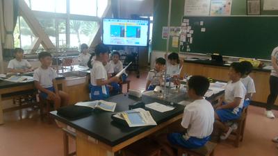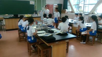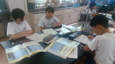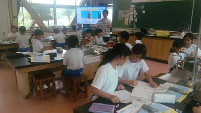理科室で4の1の子どもたちがグループ内で相談しながらワークシートに書き込んでいました。