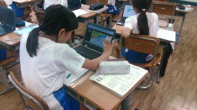 社会の授業で、「富岡市は自然災害に対してどんな対策をしているのだろう」というテーマで、今までの経験から意見交換していました。その後、富岡市のホームページなどの資料から、ハザードマップや対策の具体的な内容についてタブレットを使って積極的に調べを進めていました。