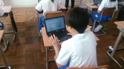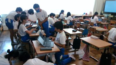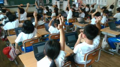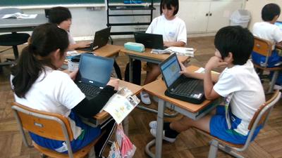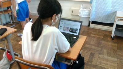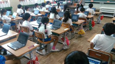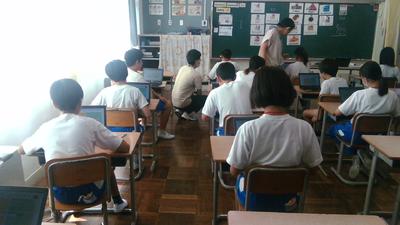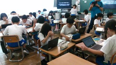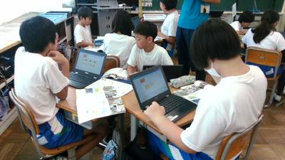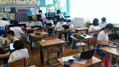 6年生の総合的な学習の時間で、「一ノ宮再発見」という単元で、本地域の良さについて調べたり、講話を聞いたり、地域に実際に出かけていって確認したりしてきました。今日は学習のまとめとして、学んだことを4年生に伝えるという目標を立て、タブレット上にまとめているところでした。