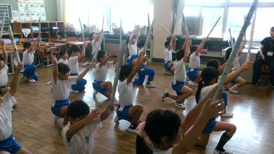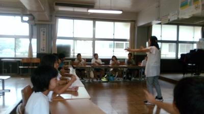 校庭は暑さで警戒度を超えているので、教室の中で細かい動きを確認します。「両手を上げる時は、少し開いて指先までまっすぐに」などと子どもたち同士で意見を交わしながら、よりきれいに見せられるように工夫していました。最後にみんなで踊ってみました。