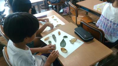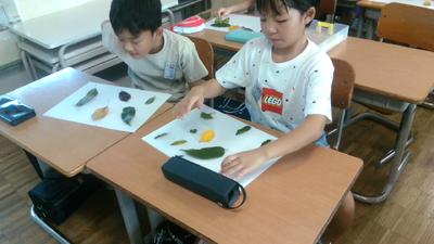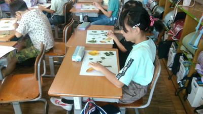 3年生の図工で葉を集めて、形や色から表したいものをイメージし、絵の具を使って作品を作る学習を行います。