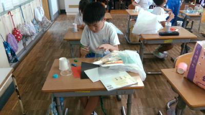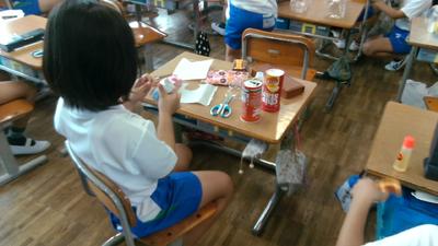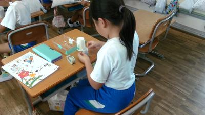 2年生の生活科で、身近にある材料を使って、動くおもちゃを作っています。今日はおもちゃの動きを工夫したり、確かめたりしながら、完成に向けて集中して楽しいおもちゃを作っていました。