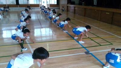 今年の5年生の遊競技は障害物リレーです。平均台や網などの障害物を通過しながら団別にリレーを行います。慎重に、楽しそうに練習していました。まわりで仲間を應援する声がたくさん聞こえてきました。