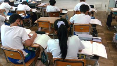 英語の教室で子どもたちが教科書を見て真剣に問題に取り組んでいました。
