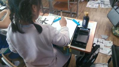 3の1の5時間目は習字の時間でした。今日学習する文字は「木」で、ポイントは右はらいに気をつける、です。まず、文字のポイントについて全体で確認しました。