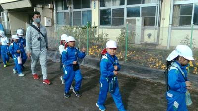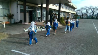 今日の午前中に、1年生が給食センターに見学に行きます。今、運転手の方に挨拶して、バスに乗って出発しました。