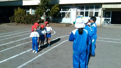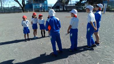 最初に挨拶して、班ごとに分かれて遊びました。まず、6年生が遊び方を説明しました。