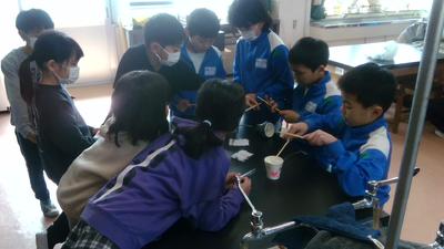 理科室で子供たちがグループで楽しそうに活動していました。