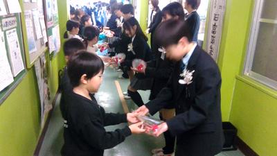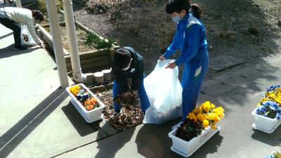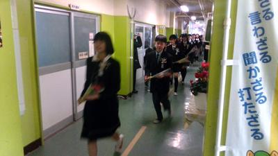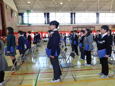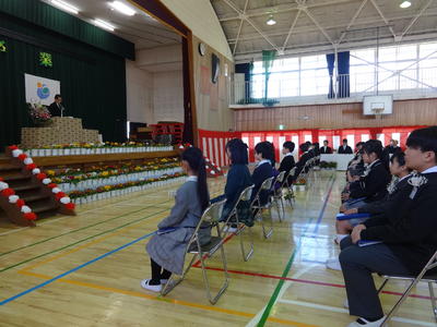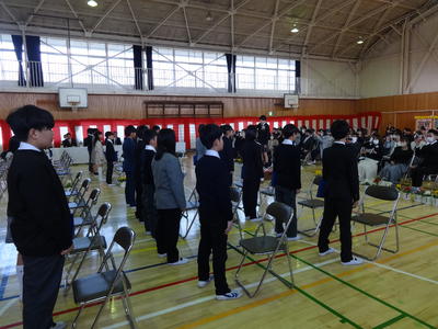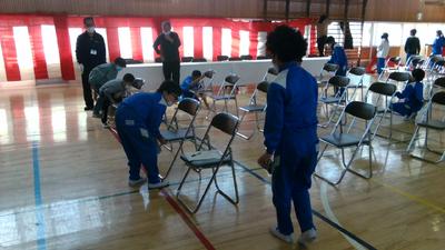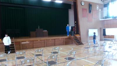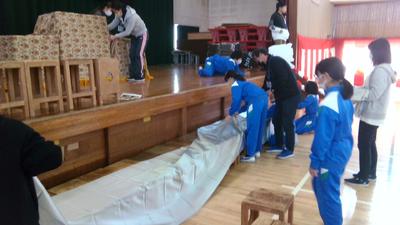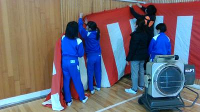 係ごとに分かれて、紅白幕や、机や椅子だし、花の準備など積極的に友達と協力して行っていました。きれいな会場に仕上がり、明日の卒業生を迎える準備ができました。